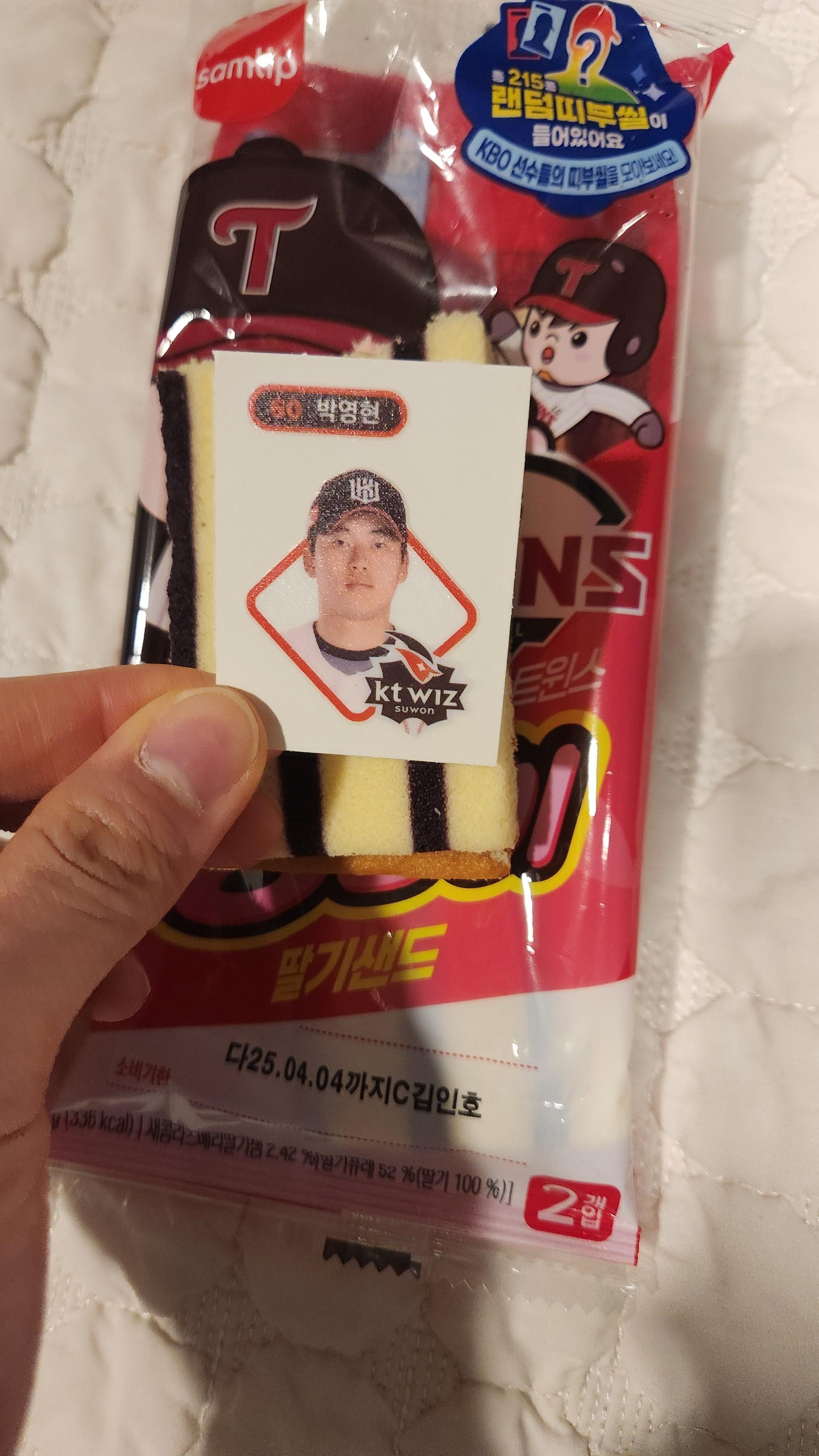 KBO빵을 구매하면 띠부씰(스티커)이 포함되어 있어요. 각 팀 선수의 캐릭터 카드로, 시즌마다 다른 디자인이 출시되기 때문에 수집하는 재미가 있습니다. 이번에 제가 뽑은 띠부씰은요!!!! (사진 참고) 망했습니다^^