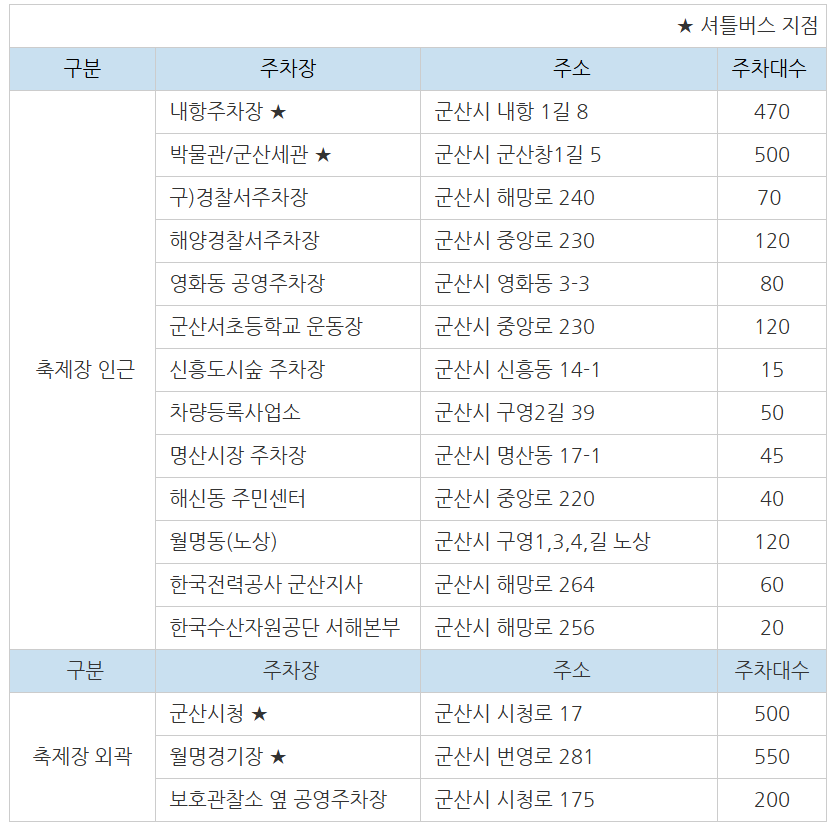 내항주차장(470대), 군산세관, 월명경기장, 영화동공영, 군산서초등학교 운동장 등 축제장 인근에 분산 운영됨.
