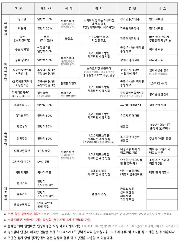 - 문화누리카드: EV석, 외야석 40% 할인