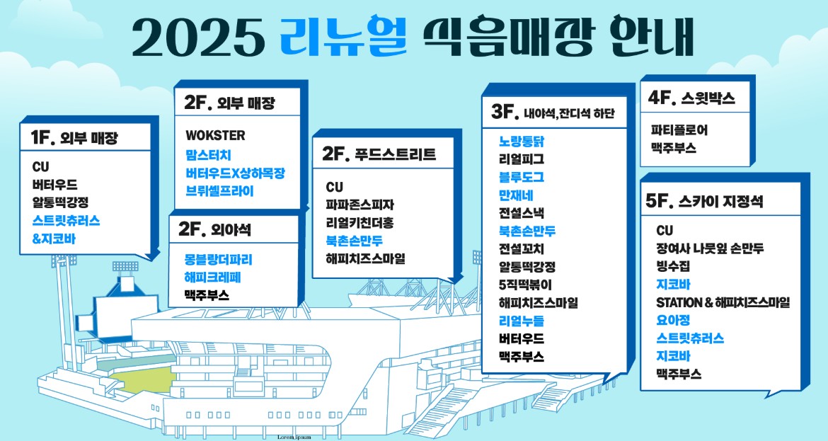 - 해피치즈스마일 & 웍스터: 차오미엔, 오렌지 슈림프, 떡볶이 등 분식과 미국식 중화요리를 즐길 수 있는 인기 매장입니다. 이재현 선수 팬세트(차오미엔+오렌지 슈림프+에그드랍 수프)가 베스트 메뉴예요.