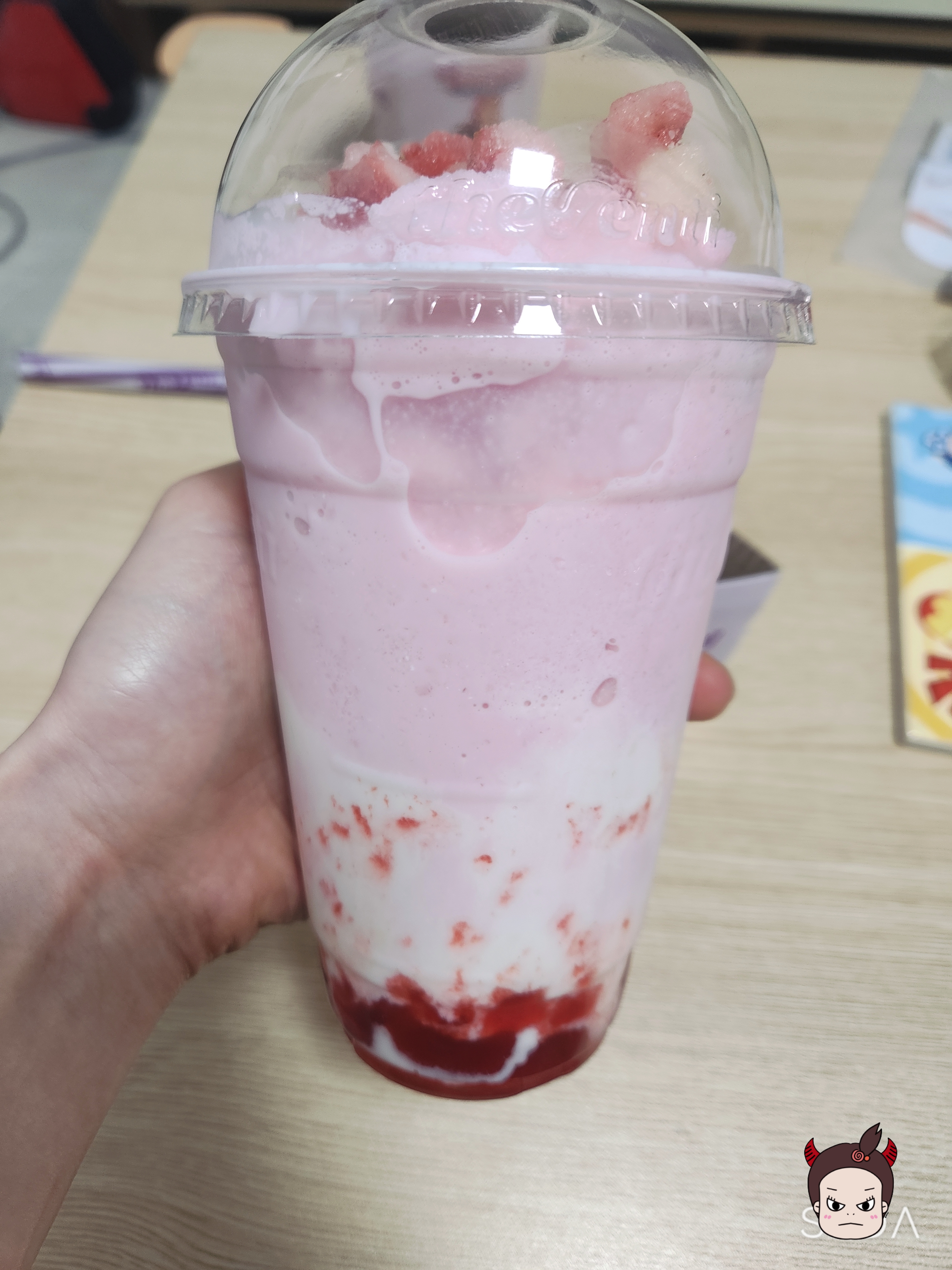 기본 베이스는 딸기 스무디 인 것 같은데 아래 딸기청과 위에 냉동딸기 큐브가 올라가있네요.