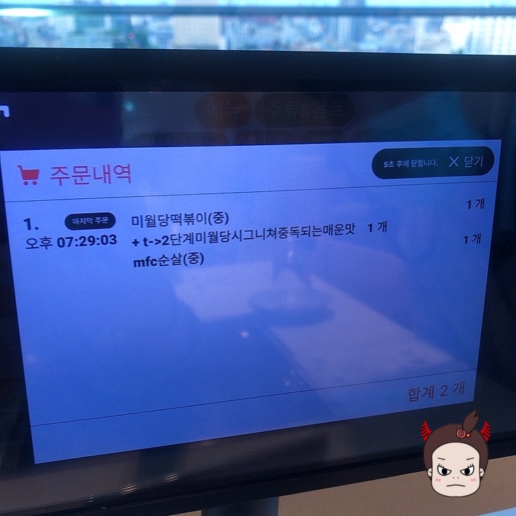 전반적으로 떡볶이는 중간맛으로 주문했는데 신라면보다 약한 매운맛 정도로 그렇게 맵지는 않았구요