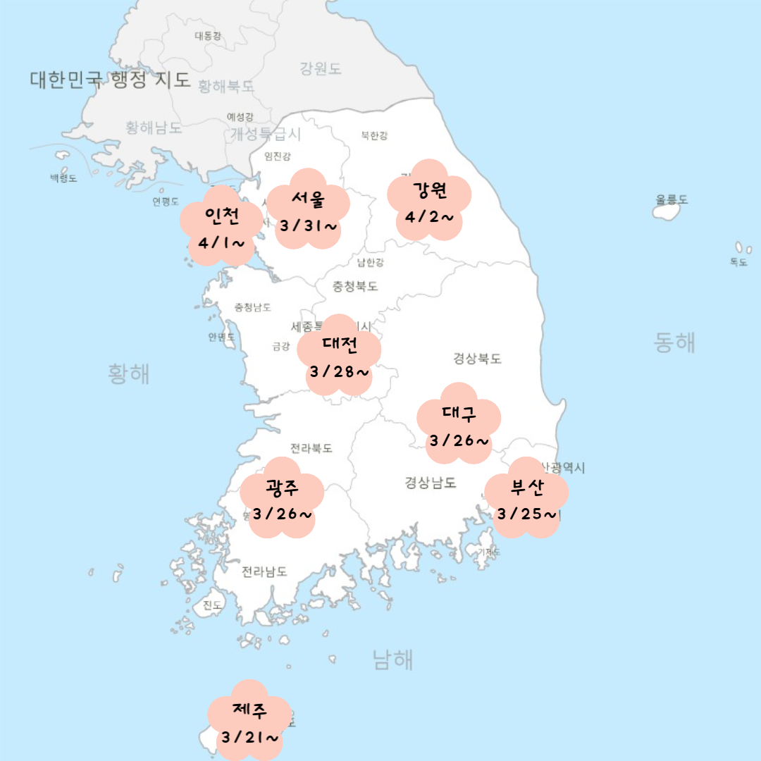 - 인천 4/1, 서울 3/31, 강원 4/2, 대전 3/28, 경북 3/29, 울산&대구 3/26, 광주 3/26, 부산 3/25, 제주 3/21