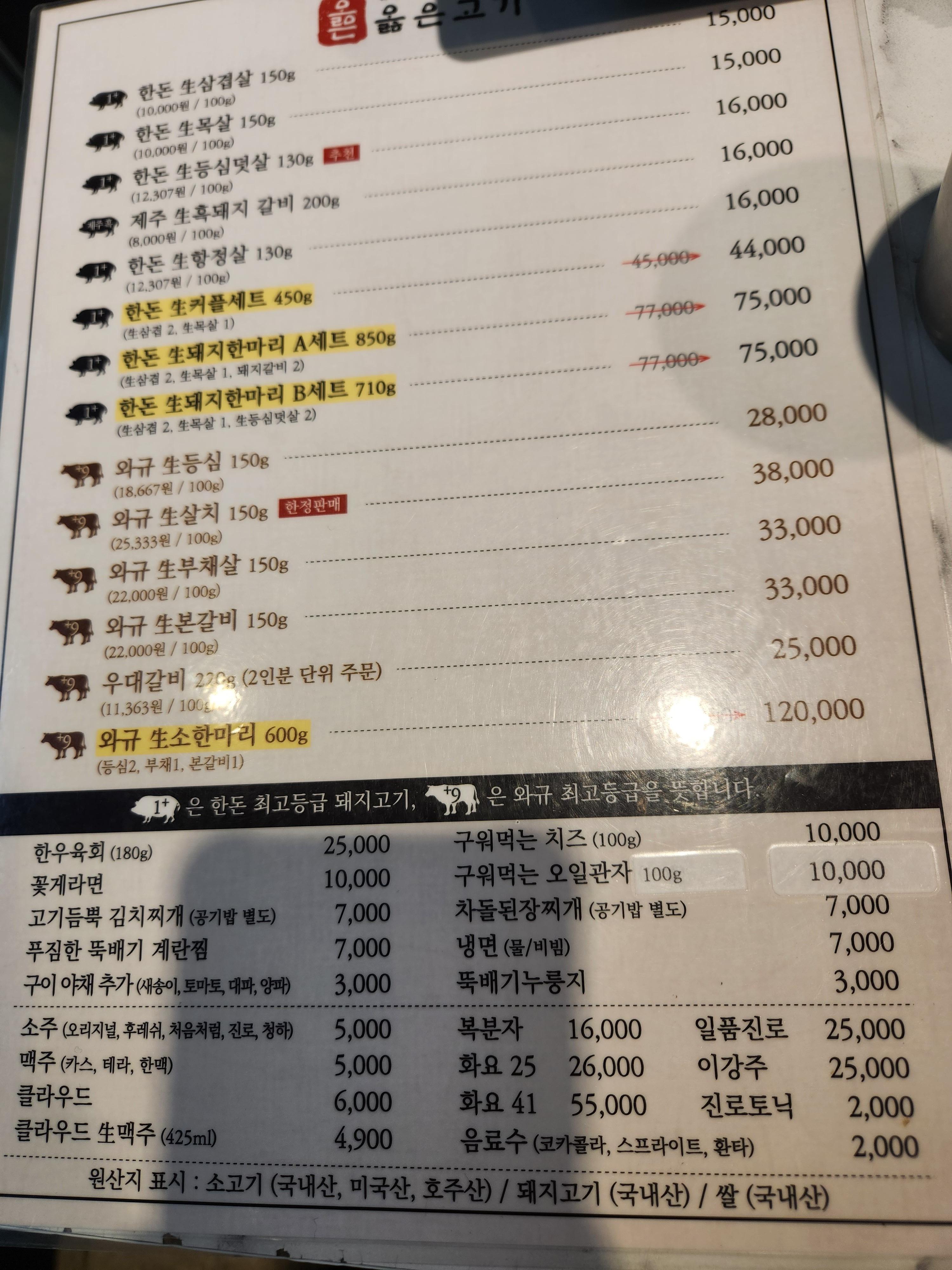 저희는 3명이서 방문해서 한동 생 커플세트(삼겹2, 목살1) 44,000원 - 추가로 와규 생 살치 38,000원 이렇게 주문했습니다.
