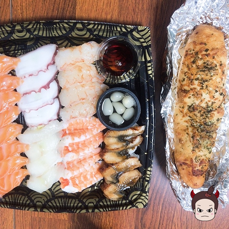 성인 남녀 두명이서 초밥 28개와 비프베이크 브레드를 다 못먹었습니다ㅋㅋ