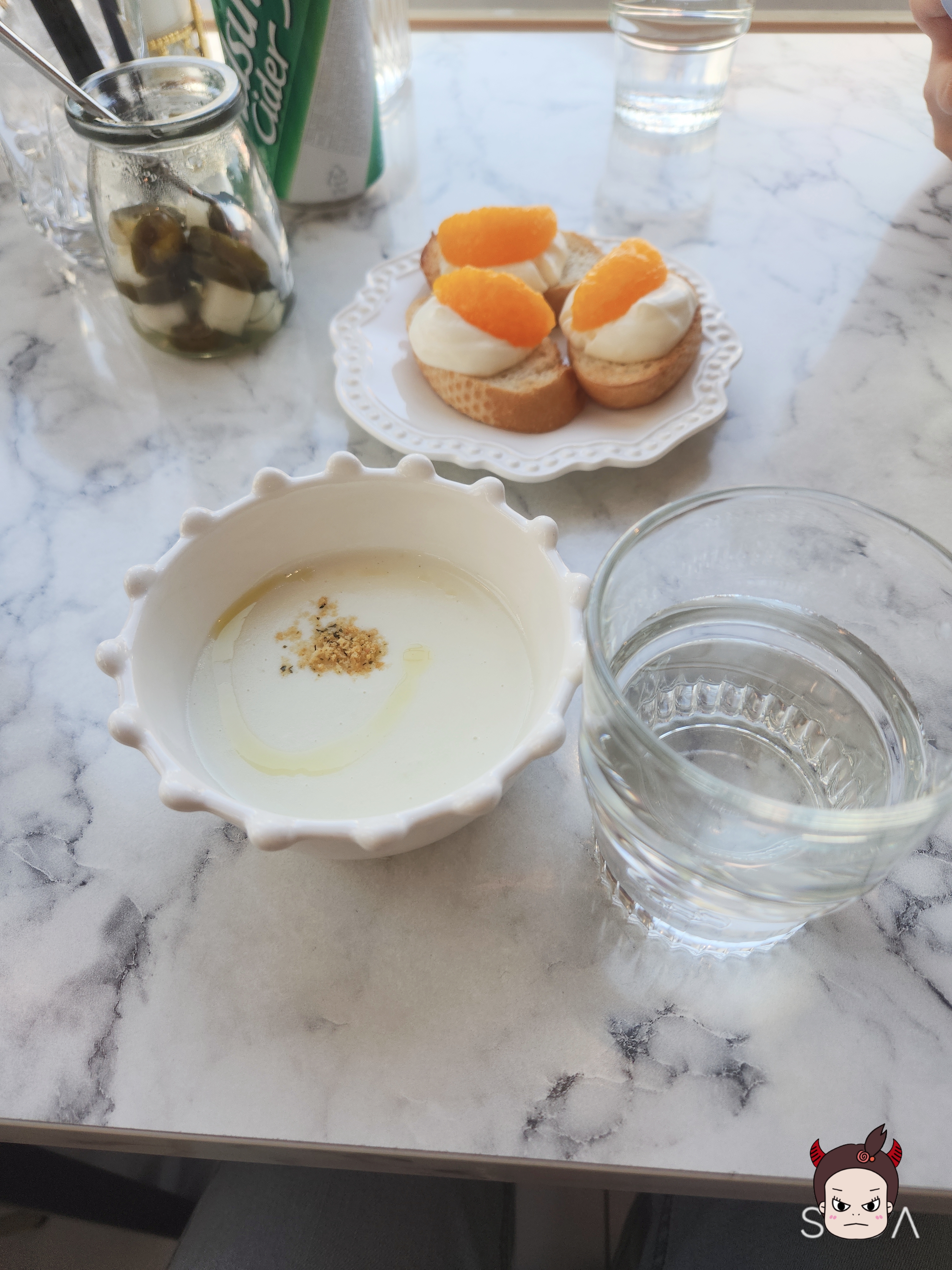 식전으로는 이렇게 귀엽게 스프와 인원수대로 바게트에 귤? 이 나왔습니다.