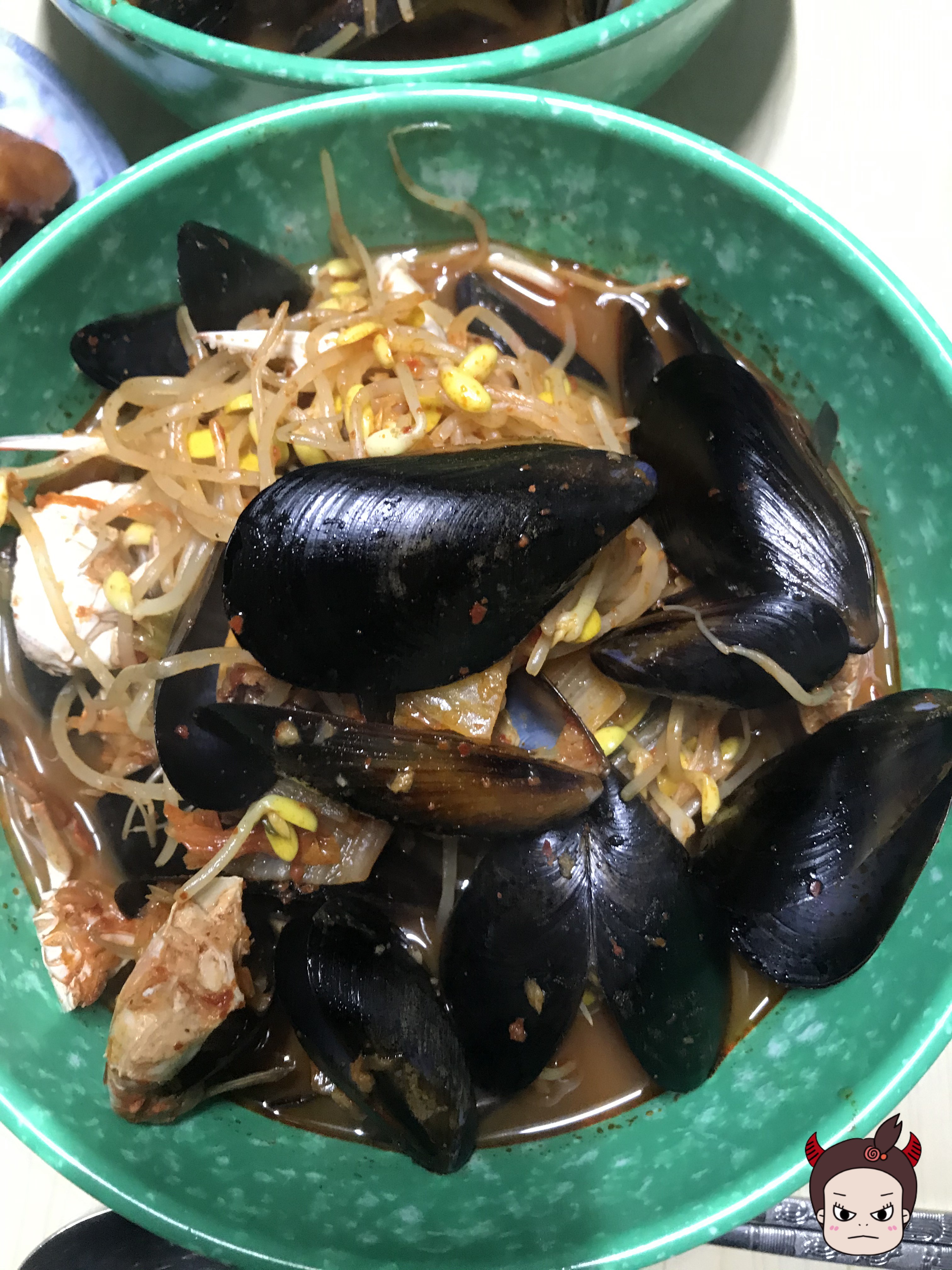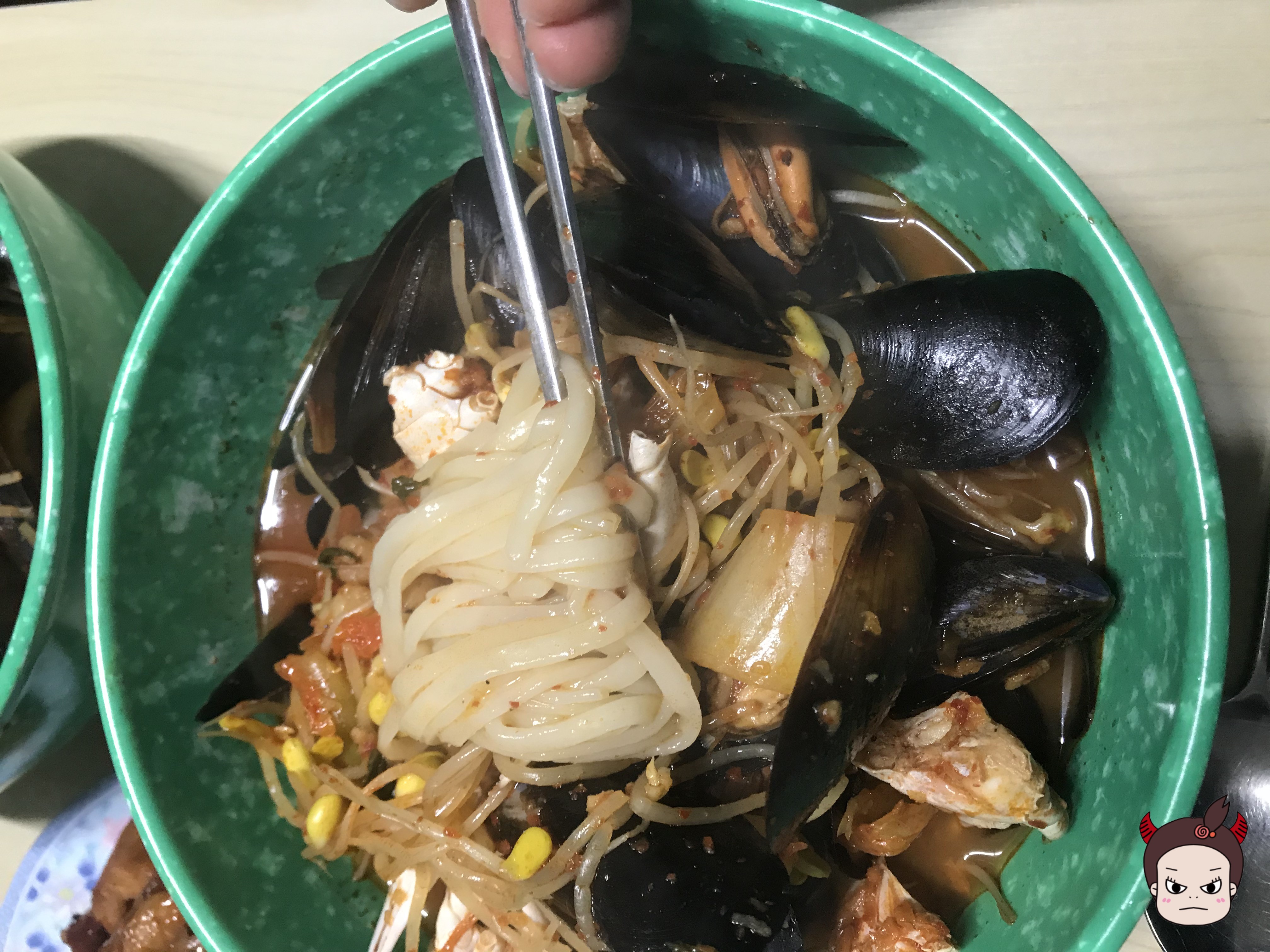 마무리로 콩나물 넣어주시고! 칼국수면도 끓여주시면 이제 짬뽕이 완성되었습니다!! >0<