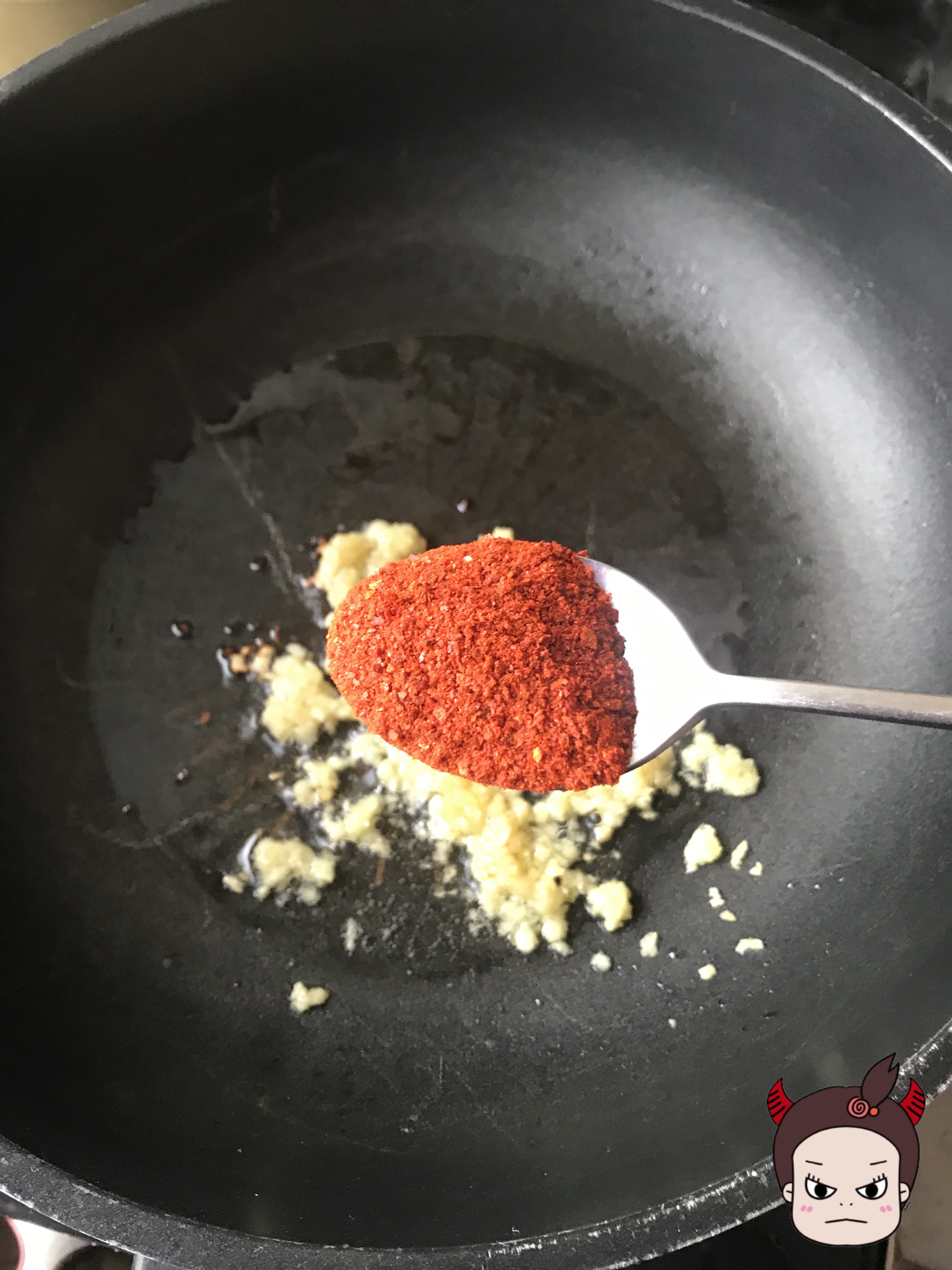 마늘 크게 1스푼, 고춧가루 4스푼을 넣고 볶아주었습니다! (고추기름을 생각하면서 볶아주었어요)